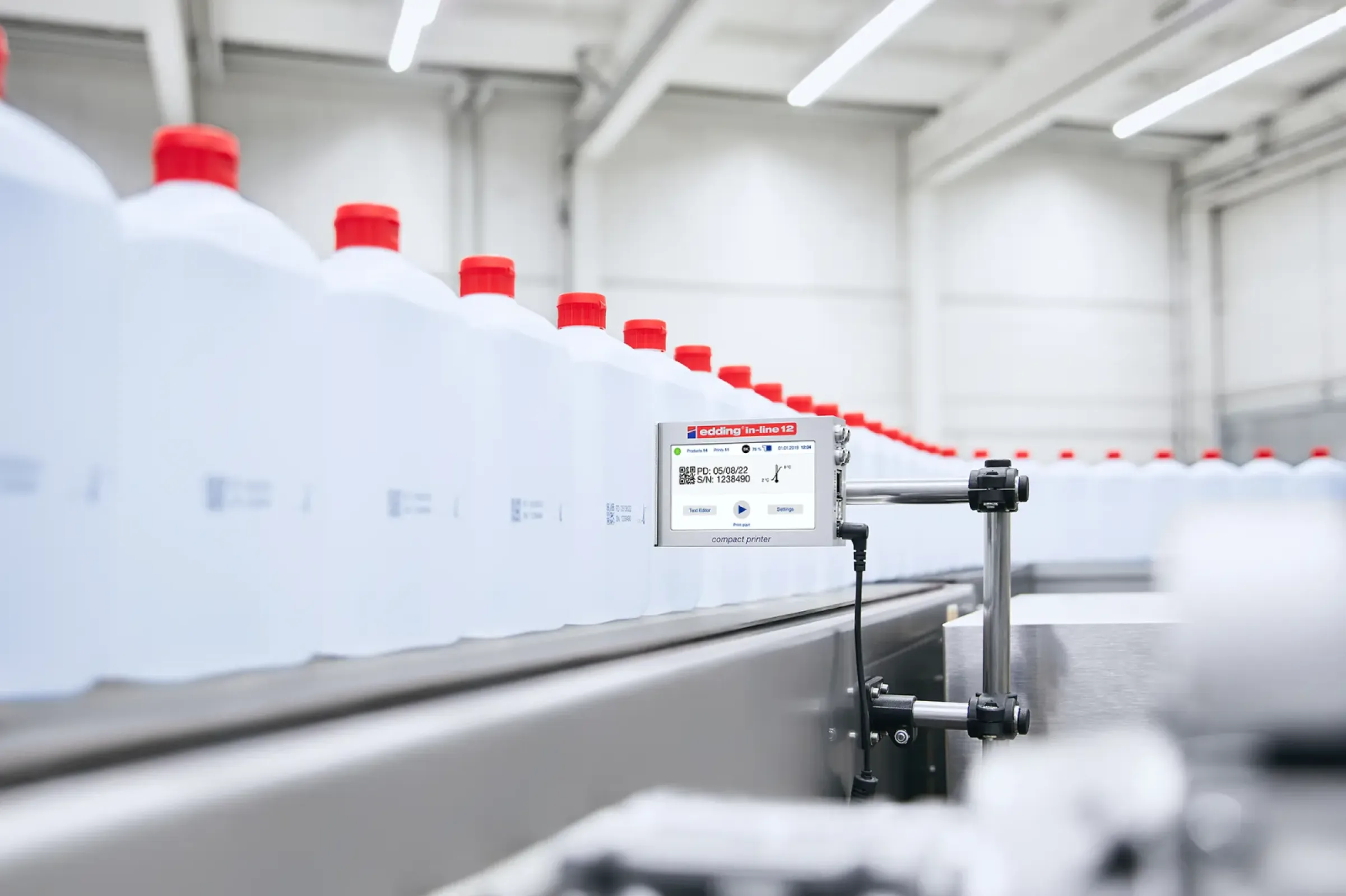 The edding in-line compact printer impresses with its outstanding reliability, which is guaranteed by the robust aluminum housing and the high-quality production and development in Germany. The availability of printers with print heights of 12 mm or 25 mm offers a wide range of applications. Another key benefit of this printer is its complete freedom from maintenance, which ensures consistently high production reliability and is therefore of great value to companies in all industries. This combination of reliability, ease of use and technical innovation makes the edding in-line compact printer an essential addition to any modern production environment.