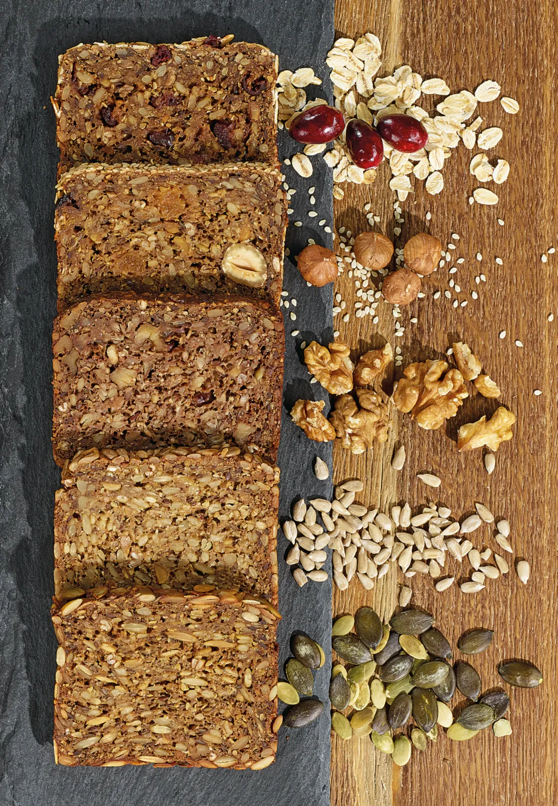 Premix for the preparation of whole grain breads supporting a modern, conscious diet. Fully Vegan, yeast free, rich in grains and seeds and with a unique nutty and aromatic flavor.